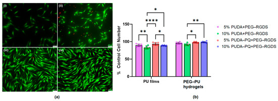 Cell adhesion and viability on crosslinked PU films and PEG–PU hydrogels were assessed through the addition of a PEGylated cell adhesion peptide, the fibronectin-derived sequence RGDS (3.5 mM), into the precursor solution for each film or hydrogel. Solutions were sterilized using 0.2 μm filters, and films and hydrogels were crosslinked by UV light. Human dermal fibroblasts (HDFs) were seeded onto the surfaces of either PU films or PEG–PU hydrogels formulated with either 5% w/v PUDA and PUDA-PQ or 10% w/v PUDA and PUDA-PQ. Following 48 h of culture on films and hydrogels, cell adhesion and viability were visualized using a LIVE/DEAD viability stain and fluorescence microscopy. HDF adhesion on photocured 5% w/v PUDA (Figure 5a, panel (i)) and PUDA-PQ films (Figure 5a, panel (ii)) is lower than that observed on 5% w/v PEG–PUDA (Figure 5a, panel (iii)) and PEG–PUDA-PQ (Figure 5a, panel (iv)) hydrogels, likely due to hindered presentation of the PEG–RGDS within the thin films. Within the water-swollen 3D matrix of the hydrogels, the PEGylated RGDS is grafted into the hydrogel backbone, leaving the adhesion peptide free to interact with cells [3,4,66], which has been shown to increase cell spreading, migration, and survival [45,67,68,69,70,71,72]. HDFs under all conditions show an elongated morphology, indicating cell spreading and significant levels of adhesion through interactions of cell-surface integrins with RGDS.