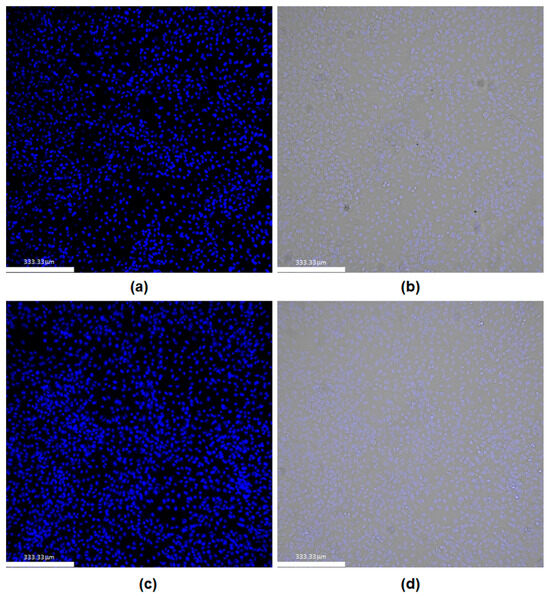 HUVEC viability after 10 days of culture on PEGDA and PEGDA–PUDA hydrogels containing acryl-PEG–RGDS and acryl-PEG–VEGF. NucBlue staining of (a) HUVEC nuclei on PEGDA hydrogels, (b) merged fluorescent and brightfield images on PEGDA hydrogels, (c) HUVEC nuclei on PEG–PUDA hybrid hydrogels, and (d) merged fluorescent and brightfield images on PEG–PUDA hydrogels. Scale bars = 333.5 μm.