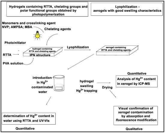 Mercury contamination of land, air, and water poses a serious threat to public health and the environment. Wastewater treatment is essential for reducing the amount of mercury released into rivers and lakes. As strong adsorbent materials, hydrogels are a feasible option to remove hazardous heavy metals from wastewater. Mercury is the third most common and second most hazardous heavy metal, according to the Agency for Toxic Substances and Disease Registry (ATSDR) from the U.S. Department of Health and Human Services [1,2]. As a result, monitoring the presence of Hg2+ is critical. Depending on the application, fluorescence sensing could represent a rapid and feasible method to detect Hg2+ ions with high sensitivity and efficiency. Qualitative methods can provide an initial estimate of mercury contamination, but a quantitative method is always necessary for precise evaluation. Atomic absorption spectroscopy (AAS) and inductively coupled plasma mass spectrometry (ICP-MS) are highly accurate techniques for the quantification of mercury contamination levels, but their main disadvantage is related to the expensive cost considerations. Ultraviolet–visible (UV–Vis) or fluorescence spectroscopy may sometimes be useful to evaluate mercury levels, but a model dye is necessary. In contrast to AAS and ICP-MS, UV-Vis or fluorescence spectroscopy could represent more straightforward methods for mercury quantification, due to their higher availability, lower costs, and ease of application, but to some extent lower accuracies.