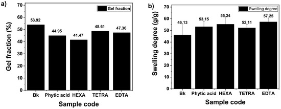 The five types of hydrogels synthesized for this study (monomer conversions ≥98%, in all cases) were analyzed to determine the gel fraction (Figure 3a) and their ability to absorb water (Figure 3b). The cross-linking efficiency between the polymeric chains inside a hydrogel can be evaluated through the gel fraction [39,40]. Figure 3a shows that the hydrogels exhibited relatively close gel fraction values. The ability of the hydrogels to swell decreases with the increase in cross-linking density [39], which is confirmed by the swelling capacity of the Bk sample compared with the rest. The polymerization reaction rate and, consequently, the crosslinking degree are dependent on the concentration of free monomer (NVP) in the system [41,42]. Thus, in the case of TETRA and EDTA, which present four carboxyl groups, a higher crosslinking degree was noticed compared with HEXA and PHYTIC, which displayed lower gel fractions, each presenting six acidic functional groups. Thus, the higher swelling capacities of the hydrogels containing chelating agents are explainable by the lower crosslinking density but also the values can be explained by the presence of supplementary ionic moieties [43] and by a higher pliability [43] of the IPN, which allow a higher intake of water. Nevertheless, according to the data obtained, we can affirm that the presence of these chelating agents during the photopolymerization process does not decrease the swelling properties of these hydrogels intended for water treatment applications.