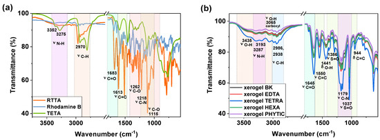 FTIR comparative multigraphs for (a) rhodamine B, RTTA, and TETA; (b) aerogels.