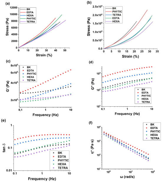 Mechanical properties of the hydrogels: (a) tensile loading mode; (b) compression loading mode; (c,d) shear loading mode; (e) tan δ multigraph; and (f) complex viscosity η vs. angular frequency.