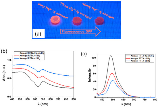 (a) Images of fluorescence modification with the increase in the amount of Hg2+ absorbed; (b) UV-Vis spectra of the aerogel samples with different Hg2+ concentrations; and (c) emission spectra of the aerogel samples with different Hg2+ concentrations, excitation wavelength 520 nm.