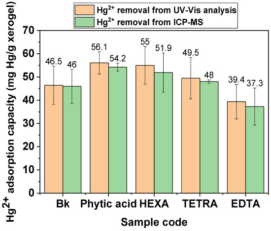 As can be observed from Figure 6, this method allows a fast, efficient route for confirming the presence of Hg2+, but could also allow a qualitative evaluation of the mercury levels. Initially, at low Hg2+ concentrations, the fluorescence is increased due to a fluorescence “on” effect (Scheme S1); however, at higher Hg2+ concentrations and due to the high RTTA amount in the aerogels, the fluorescence is gradually turned off [51,52]. The fluorogenic switch-off (Scheme S2) sensing of Hg2+ [31] could be explained by the interruption of the intramolecular conjugation in RTTA molecules through the new interactions established by the nitrogen atoms with Hg2+ ions. For a more accurate evaluation of the mercury removal efficacy, quantitative methods were employed, which are further described. The mercury decontamination survey was performed following two routes: (i) UV-Vis analysis (Figure 7 and Figure S3) of the decontaminated aqueous solutions (post-decontamination residual mercury), and (ii) ICP-MS analysis of the absorbent (mercury entrapped in the aerogels). The results obtained are illustrated comparatively in Figure 8. A good correlation between the results was obtained from the two analytical techniques employed in the Hg2+ decontamination survey. The samples incorporating phytic acid revealed the best removal efficacy for mercury, followed by the ones containing triethylenetetramine-hexaacetic acid (HEXA) and 1,3-diamino-2-hydroxypropane-tetraacetic acid (TETRA), while the samples containing EDTA led to inferior results. The results obtained were in accordance with the amount of chelating units incorporated into the hydrogels and are dependent on the molecular structures of the Hg2+/chelating agent complexes formed [53,54,55].