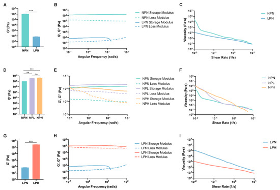 Rheology properties, including stiffness, modulus, and viscosity. (A–C) NPN and LPN hydrogels. (D–F) NPN, NPL, and NPH hydrogels. (G–I) LPN and LPH hydrogels. The average stiffness is the storage modulus within the linear viscoelastic region. All x-y plots are representative samples ** p < 0.01, *** p < 0.001, ns: not significant.