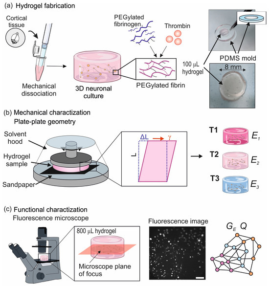 Three different variations of PEGylated fibrin hydrogels were prepared, with concentrations of 10%, 25%, and 65% in volume of thrombin, and labeled T1, T2, and T3 PEGylated fibrin, respectively. The concentrations were selected according to the capacity to fabricate reproducible hydrogels. Concentrations of thrombin lower than 10% led to a mixture that failed to gel, while concentrations larger than 65% saturated the material of free thrombin due to the shortage of fibrinogen, making the final material unstable and unreliable. For mechanical characterization, and to fit the diameter of the rheometer head, a first batch of hydrogels was prepared and gellified inside an 8 mm diameter hollow cylinder made of Polydimethylsiloxane (PDMS), with a final volume of L. These volumes yielded relatively small networks that contained an insufficient population of neurons for a reliable functional analysis. Thus, a second batch of hydrogels was concurrently prepared inside 13 mm diameter, 10 mm height plastic wells (4-well plates, Nunc), with each hydrogel containing about 1000 cells in an L volume.