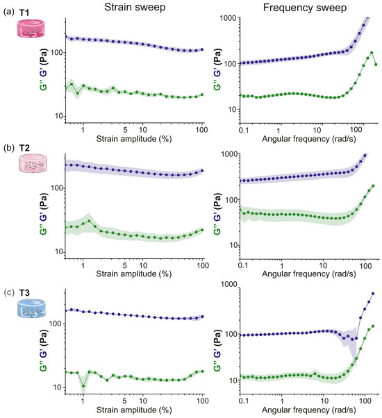Small Amplitude Oscillatory Shearing (SAOS) rheology was applied in order to characterize the viscoelastic properties of T1, T2 and T3 hydrogel scaffolds. The materials underwent testing subjected to controlled shear deformation, characterized by sinusoidal oscillations , with being the strain amplitude and the oscillation frequency. By restricting the tests to the linear viscoelastic regime (LVR), a viscoelastic material typically exhibits both in-phase and out-of-phase components. The stress response can be formulated as , where (storage modulus) is related to the storage of elastic energy or solid-like behavior, and (loss modulus) is related to the viscous dissipation of energy or liquid-like behavior [59].