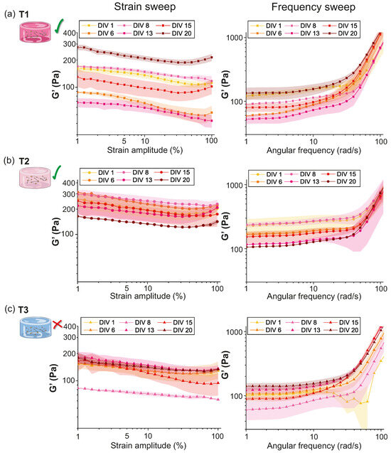 The right panels of Figure 4a–c display the results obtained for the frequency sweep tests conducted at = 5%. It is worth noticing that the gel-characteristic low-frequency plateau was present in all the samples at different DIVs. However, we observed differences in the behavior exhibited by the samples, with the plateau regime ending at frequencies of rad/s for T1 and T3 hydrogels, and extending to approximately rad/s for the T2 ones.