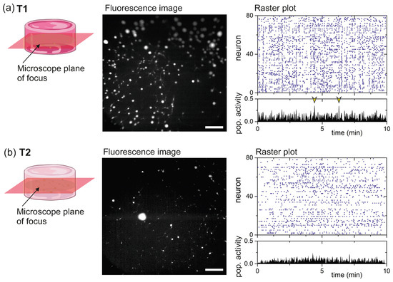 The right panels of Figure 6 show representative raster plots of recorded spontaneous activity at DIV 15, a mature stage in the networks, and for the T1 (Figure 6a) and T2 (Figure 6b) hydrogels. Activity was abundant in both cases, although the soft T1 hydrogel was slightly more active ( activations per neuron and minute) than the stiff T2 one ( activations). Additionally, T1 exhibited a clear tendency towards stronger synchronization as compared to T2, as revealed by the population activity panels below the raster plots. The population activity counts the fraction of neurons in the network that coactivate in a short time window. For the T1 hydrogel, we can observe strong peaks (marked with yellow arrows) that reveal episodes of neuronal coordinated activity, which are absent in the T2 hydrogel.