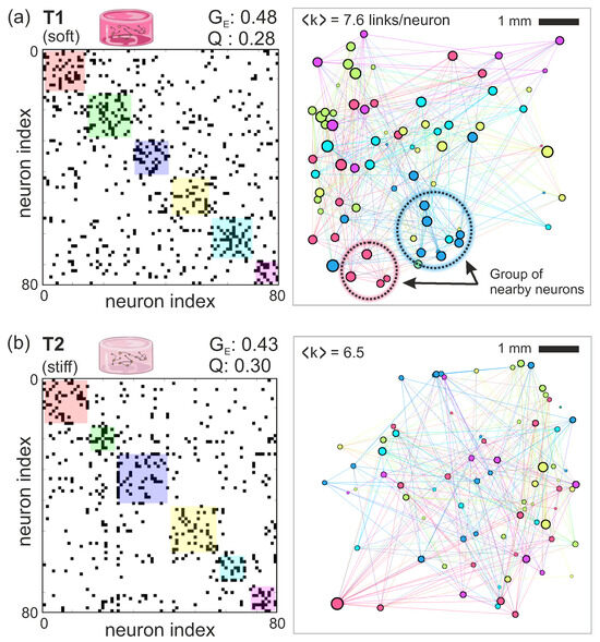 As a first difference between the two preparations, the soft T1 hydrogels had an average connectivity of connections per neuron, higher than the stiff T2 hydrogel with connections per neuron. This higher average connectivity of T1 is expected given its strongest synchronization and that translates into a higher communication of neurons across the network. The overall strong network cohesion of T1 is also reflected by the global efficiency , the bulk network property that captures the flow of information in the network, with for T1 and for T2, i.e, neurons in T1 were about 15% more efficient communicating across the network. On the other hand, both hydrogels exhibited practically the same modularity , indicating that neurons tended to form functional communities in a similar way. This means that, despite the higher synchronization of T1 hydrogels, neurons in both preparations maintained specialized communication at a local scale. Interestingly, as shown in the T1 network map of Figure 7a, neurons within a community (particularly the pink and blue) were physically nearby, possibly reflecting the presence of short axons that mediated local communication. In turn, these short axons were combined with longer ones that facilitated whole network synchronization. Such a physical proximity of neurons within a community is not so clear in the T2 hydrogels (Figure 7b). We hypothesize that axons could be longer here, but that they did not orchestrate abundant synchronization possibly due to the observed low connectivity.