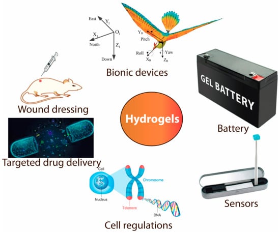 Stimuli-responsive hydrogels, as the name suggests, are gels that are sensitive to the changes in the external environment and act accordingly by bringing a change in their structural or mechanical changes [10]. This new polymeric hydrogel class is increasingly gaining attention in medical and robotics applications due to its ability to respond to changes in external environments. Various kinds of stimuli are light/photon [11], magnetic field [12], electric field [13], temperature [14], biological triggers [15], pH [16], and some chemicals can be used to bring desired phase changes inside hydrogels to manifest different applications such targeted drug delivery [17], sensing, bionic devices [18], regenerative medicines, and more (Figure 2) [19,20].