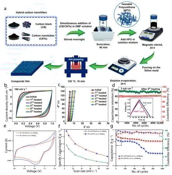 Alshareef and co-workers [42] reported a detailed study on developing solid-state asymmetric supercapacitors (ASCs) using conducting polymer electrodes on a flexible plastic substrate. Electrochemically deposited nanostructured conducting polymers, poly(3,4-ethylenedioxythiophene) (PEDOT) and polyaniline (PANI), are utilized on Au-coated polyethylene naphthalate (PEN) plastic substrates. With its electron-donating oxygen groups, PEDOT serves as a negative electrode due to its higher reduction potentials. Its stability in the oxidized state allows it to exhibit electrochemical activity across a wide potential window. The ASCs, employing PANI as a positive electrode and polyvinyl alcohol (PVA)/H2SO4 gel electrolyte, demonstrate impressive performance with a maximum power density of 2.8 W cm−3 at an energy density of 9 mW h cm−3. This surpasses carbonaceous and metal oxide-based ASC solid-state devices. Additionally, the tandem configuration of these ASCs successfully powers a red light-emitting diode for approximately 1 min after a 10 s charge, showcasing their potential for practical applications. A recent study by Lee’s group [43] presented a novel approach to fabricating a symmetric supercapacitor with multiple functionalities, including high capacitance, high-rate capability, flexibility, and self-healing properties (Figure 3a). The design involves a composite current collector electrode comprised of a self-healable material (poly(3,4-ethylenedioxythiophene): poly(styrene sulfonate)/multiwalled carbon nanotubes) and a poly(vinyl alcohol)/phosphoric acid electrolyte. The key innovation lies in the use of a hybrid carbon nanofiller (HCF) coupled with healable polymer matrices (HCF/HPU), forming a self-healing, highly conductive composite current collector. The self-healing property was demonstrated by the recovery of capacitance in successive cycles (Figure 3b). The Nyquist plot indicates that its resistance increases slightly over their continued cycles (Figure 3c). This composite exhibits enhanced electrical properties and mechanical strength compared to single nanofillers. The resulting supercapacitor demonstrates high specific capacitance, energy density, and cycling stability, with only ~10% capacitance loss after 20,000 charge/discharge cycles at a high current density of 10 mA cm−2. Moreover, the HCF/HPU composite current collector supercapacitors exhibit remarkable self-healing capabilities, retaining over 96.2% of their capacitance after severing/healing cycles and maintaining 97.4% capacitive retention after 2000 bending cycles (Figure 3d). These findings position the HCF/HPU composite current collector as a promising candidate for high-performance flexible energy storage devices. In another study on electrodes to potentially improve the supercapacitor performances, nanoscale α-NiMoO4 particles encapsulated within electronically conducting polymer nanocomposites (PNCs) were developed using a base of Polyvinyl alcohol (PVA)/Poly(vinyl) pyrrolidone (PVP) [44]. The electrochemical characteristics of the developed polymer nanocomposites (PNCs) were examined, revealing a maximum specific capacitance of 15.56 F g−1 for a polymer-blended electrode loaded with 1 wt % of α-NiMoO4 nanoparticles (NPs) at a scan rate of 5 mV s−1. When evaluated in a two-electrode system at room temperature, the PNCs displayed an impressive 97.12% Coulombic efficiency at room temperature, using a 3 M KOH aqueous electrolyte solution. The CV curve shows a larger scan area at a given potential for the synthesized electrode (Figure 3e), while the specific capacitance at a varying scan rate is plotted in (Figure 3f). It is revealed that the synthesized electrode becomes crystalline due to the increase in cross-linking densities of the composites, leading to high capacitance retention, as shown in (Figure 3g). These hybrid composite gel combustion synthesis techniques can significantly improve the electrochemical performance of the supercapacitors.