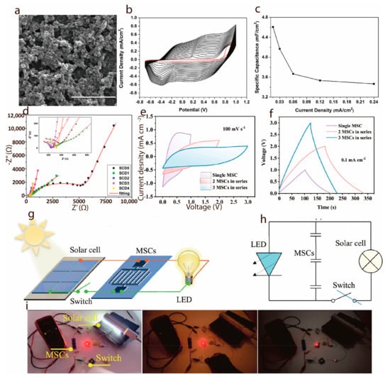 The use of flexible polymer gel electrolytes in FSCs is gaining much attention to improve the electrochemical performances of supercapacitors. In this direction, several researchers have developed several gel electrolytes, such as PVA/H3PO4 [55], PVA/H2SO4 [56,57,58,59], PVA/KOH [60,61,62], PVA/LiOH [63], PVA/Na2SO4 [64], PVA/KNO3 [65], PVA/KCl [66], PVA/LiCl [67], etc., to enhance the versatility of gel electrolytes for use in various conditions. Esawy et al. [68] extensively studied different aqueous electrolytes such as KOH, H2SO4, H3PO4, and six different gel electrolytes (PVA/KCL, PVA/H3PO4, PVA/H2SO4, PVA/KOH, PVA/KOH–KCl–K3[Fe(CN)6], and PVA/KNO3) and employed them in the fabrication of flexible supercapacitors. The electrochemical characteristics of these diverse electrolytes are assessed through cyclic voltammetry, galvanostatic charge/discharge curves, and impedance spectroscopy. Among these, the capacitor utilizing a PVA–KOH–KCl–K3[Fe(CN)6] electrolyte membrane with a weight ratio of 60:23:23:4 exhibits the highest specific capacitance of 520 F g−1. Furthermore, it demonstrates a prolonged cycling life, with 98.1% retention after 1000 cycles, and its specific capacitance shows an increase with temperature elevation from 25 to 70 °C. The enhanced electrochemical performances of this gel electrolyte is due to its larger electrode capacitance (520 F g−1) and reduced charge-transfer resistance (Rct) value. To further improve the electrochemical performances of supercapacitors, gel electrolyte modification on D-A-D-type conjugated polymer technique was adapted [69]. To significantly enhance the device performance, TiO2 NPs were integrated into the PMMA/TBAPF6-containing gel electrolyte, with the optimization of the TiO2. An irregular porous structure was revealed under SEM (Figure 5a). The impact of TiO2 addition on device performance was evident in the increased ionic conductivity observed. The highest area-specific capacitance was recorded at 3.30 mF cm−2 at 2 mV s−1 and 3.08 mF cm−2 at 0.015 mF cm−2. The plots of the CV curves obtained shows onset oxidation potential at 0.75 V, much lower than EDOT, resulting from enlarged conjugated block (Figure 5b). A plot of specific capacitance and its peculiar decline on increased current density is shown in Figure 5c. The maximum energy density reached 1.47 μW·h cm−2, accompanied by a corresponding power density of 13.5 μW cm−2. Furthermore, the electrochemical stability of the supercapacitor devices was assessed through 1000 galvanostatic charge–discharge (GCD) cycles, revealing excellent stability in terms of both % capacity retention and % Coulombic efficiency. The improved performance of this device can also be understood by a reduced Rct value, shown in Figure 5d. Another study showed that supercapacitor’s performances can be further improved by using liquid crystal gel electrolyte [70]. This study developed a sunlight-powered energy storage system using single-wall carbon nanotubes (SWCNTs)-based symmetric micro-supercapacitors (MSCs) fabricated through a facile one-step spraying method. The electrodes exhibited satisfactory conductivity, and all-solid-state MSC devices were designed using potassium hydroxide-poly(vinyl alcohol) (KOH-PVA) and phosphoric acid-nonionic surfactant liquid crystal (PANI LC) gel electrolytes. The SWCNTs/PANI LC electrolyte demonstrated superior performance, exhibiting a larger areal capacitance of 11.0 mF·cm−2 at room temperature. The CV and GCD measurements are shown in Figure 5e,f. Temperature effects on device performance were investigated, revealing enhanced electrochemical performance at 65 °C, including a larger areal capacitance of 14.7 mF·cm−2, better rate performance, and higher energy density. The MSC device also demonstrated high cyclic stability under bending conditions. Moreover, a sunlight-powered energy storage system was constructed, combining solar cells with the MSC devices, showcasing continuous operation of a red light-emitting diode for 2 min and 30 s (Figure 5g–i). These results suggest the promising practical application potential of the MSC devices as efficient energy storage solutions, particularly at elevated temperatures.