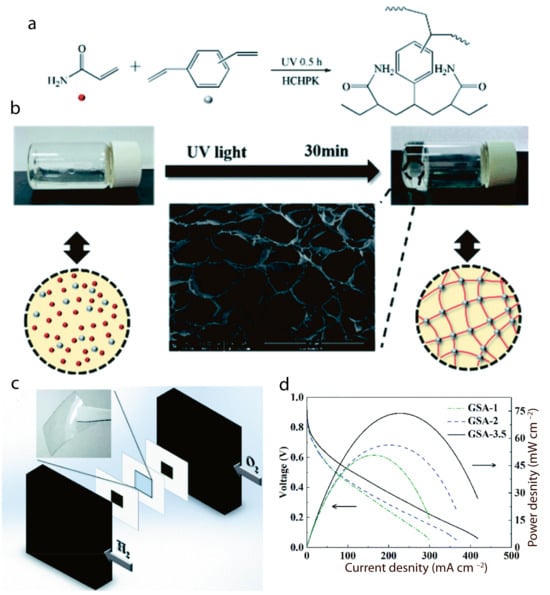 In the study of Wang et al. [72], aq. H2SO4 solutions with concentrations ranging from 1 to 4 mol L−1 are fabricated into gel membranes through the in situ polymerization of acrylamide as a monomer and divinylbenzene as a crosslinker (Figure 6a). The obtained mixture was poured into a silica mold with a piece of a glass tube and irradiated under UV (365 nm) to turn it into a transparent gel (Figure 6b). This process is advantageous for electrochemical applications and offers benefits such as easy shaping and reduced leaking. The gel membrane with a sulfuric acid concentration of 3.5 mol L−1 demonstrates a peak proton conductivity of 184 mS cm−1 at 30 °C. Additionally, the tensile fracture strength of the gel membrane reaches 53 kPa with a tensile strain of 14. Thermogravimetric analysis indicates thermal stability up to 231 °C. Furthermore, the gel membranes are effectively integrated into fuel cells (Figure 6c), achieving a peak power density of 74 mW cm−2 (Figure 6d). Notably, the fuel cell maintains steady operation for over 200 h. The in situ gelation of aqueous sulfuric acid solutions presents an efficient strategy for preparing gel electrolytes tailored for electrochemical devices, showcasing promising results for fuel cell applications.