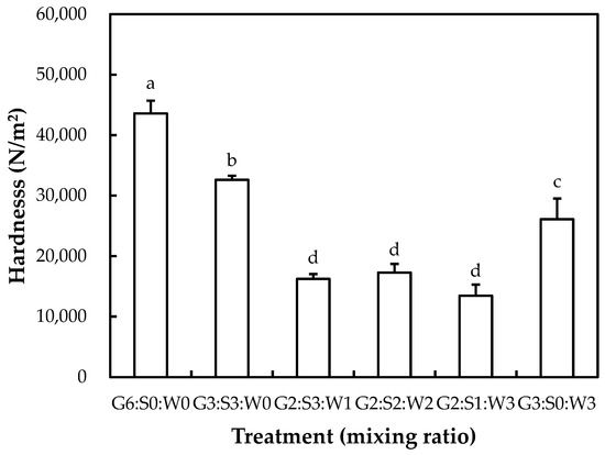 Hardness of the mixed gelatin gels with soy protein isolate and whey protein concentrate. G–pig skin gelatin; S–soy protein isolate; W–whey protein concentrate. Each bar refers to the standard deviation of the mean (n = 3). (a–d) Means with the same letters are not significantly different (p ≥ 0.05).