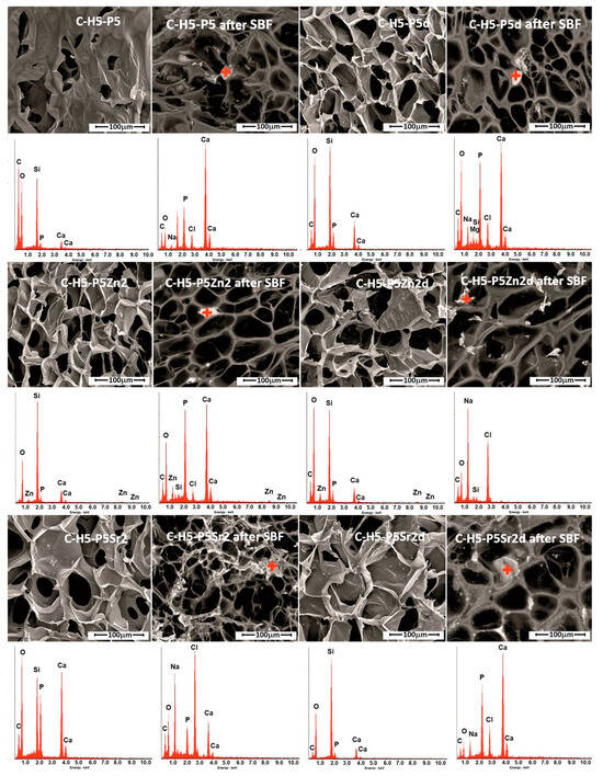 SEM-EDS analysis of chitosan/sodium hyaluronate/bioglass composites containing 5% wt. of sodium hyaluronate, 47.5% wt. of chitosan, and 47.5% wt. of bioglass treated at 550 °C/3 h (C–H5–P5, C–H5–P5Zn2, C–H5–P5Sr2) or bioglass treated at 650 °C/10 h (C–H5–P5d, C–H5–P5Zn2d, C–H5–P5Sr2d) before and after 21 days of incubation in SBF solution. Scale bar in SEM pictures is equal to 100 µm.