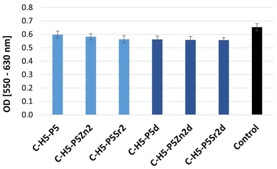 The concentration of Zn2+ ions released from the tested composites does not exceed the level considered a therapeutic dose, which, according to Kapoor [46], may be 2 mg/L. The highest concentration of Zn2+ ions was determined for the C–H10–P5Zn2 composite and it was equal to 0.34 ± 0.03 mg/L. The concentration of Sr2+ ions released from the composites is below the level considered appropriate to stimulate the osteogenic response, which, according to the literature [47], is in the range from 3 to 6 mg/L. The Sr2+ ion concentration closest to the lower limit of this range was determined for the C–H10–P5Sr2d sample as 2.45 ± 0.29 mg/L.