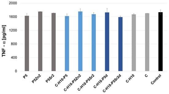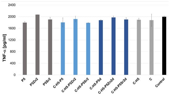 Production of LPS-induced TNF-α in WBC cultures in the presence of extracts from bioglass samples treated at 550 °C/3 h (P5, P5Zn2, P5Sr2) and composites containing 5% wt. of sodium hyaluronate, 47.5% wt. of chitosan, and 47.5% wt. of bioglass treated at 550 °C/3 h (C–H5–P5, C–H5–P5Zn2, C–H5–P5Sr2) or at 650 °C/10 h (C–H5–P5d, C–H5–P5Zn2d, C–H5–P5Sr2d) and the reference: hydrogel containing 95% wt. chitosan and 5% wt. sodium hyaluronate (C–H5) and hydrogel containing 100% wt. chitosan (C) in comparison with WBC culture without any extract (control).