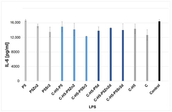Production of LPS-induced IL-6 in WBC cultures in the presence of extracts from glass samples treated at 550 °C/3 h (P5, P5Zn2, P5Sr2) and composites containing 5% wt. of sodium hyaluronate, 47.5% wt. of chitosan, and 47.5% wt. of bioglass treated at 550 °C/3 h (C–H5–P5, C–H5–P5Zn2, C–H5–P5Sr2) or at 650 °C/10 h (C–H5–P5d, C–H5–P5Zn2d, C–H5–P5Sr2d) and the reference: hydrogel containing 95% wt. chitosan and 5% wt. sodium hyaluronate (C–H5) and hydrogel containing 100% wt. chitosan (C) in comparison with WBC culture without any extract (control).