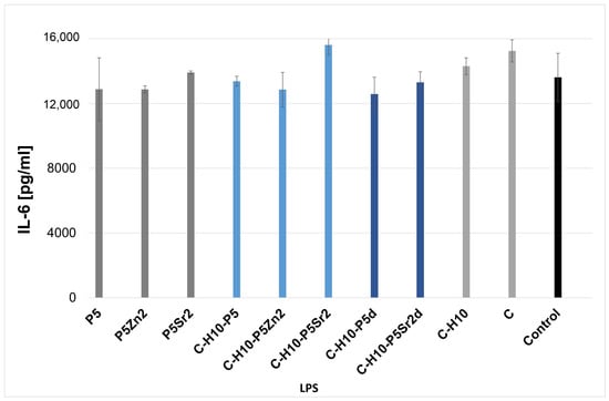 Production of LPS-induced IL-6 in WBC cultures in the presence of extracts from glass samples treated at 550 °C/3 h (P5, P5Zn2, P5Sr2) and composites containing 10% wt. of sodium hyaluronate, 45% wt. of chitosan, and 45% wt. of bioglass treated at 550 °C/3 h (C–H10–P5, C–H10–P5Zn2, C–H10–P5Sr2) or at 650 °C/10 h (C–H10–P5d and C–H10–P5Sr2d) and the reference: hydrogel containing 90% wt. chitosan and 10% wt. sodium hyaluronate (C–H10) and hydrogel containing 100% wt. chitosan (C) in comparison with WBC culture without any extract (control).