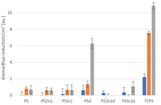 Viability of MG-63 osteoblast-like cells cultured on bioglasses (P5, P5Zn2, P5Sr2 and P5d, P5Zn2d, P5Sr2d) tested using AlamarBlue® on days 1, 3, and 7 (blue, yellow, and grey bars, respectively). The results are presented as average standard deviation, n = 3; statistically significant differences compared to TCPS for the corresponding time points at p < 0.001 were found for all the samples.