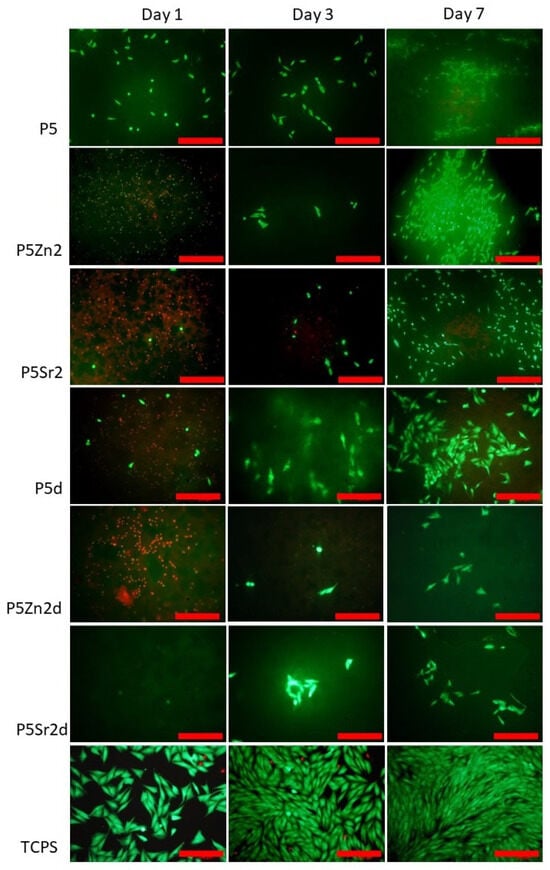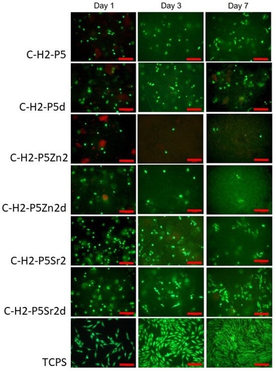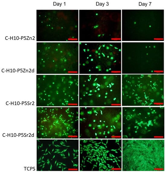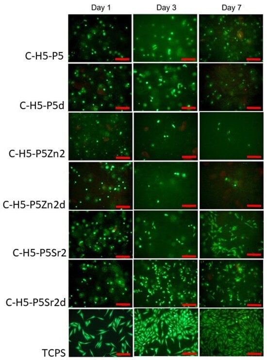 Live/dead viability staining (green—live cells; red—dead cells) for MG63 cells cultured on biocomposites containing 5% wt. of sodium hyaluronate, 47.5% wt. of chitosan, and 47.5% wt. of bioglass treated at 550 °C/3 h (C–H5–P5, C–H5–P5Zn2, C–H5–P5Sr2) or at 650 °C/10 h (C–H5–P5d, C–H5–P5Zn2d, C–H5–P5Sr2d) on days 1, 3, and 7. Scale bar—200 μm.