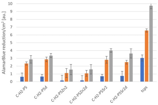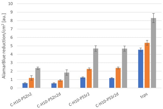 Viability of MG-63 osteoblast-like cells cultured on biocomposites containing 2% wt. of sodium hyaluronate, 49% wt. of chitosan, and 49% wt. of bioglass treated at 550 °C/3 h (C–H2–P5, C–H2–P5Zn2, C–H2–P5Sr2) or at 650 °C/10 h (C–H2–P5d, C–H2–P5Zn2d, C–H2–P5Sr2d) tested using AlamarBlue® on days 1, 3, and 7 (blue, yellow, and grey bars, respectively). The results are presented as average standard deviation, n = 3; statistically significant differences compared to TCPS for the corresponding time points at p < 0.001 were found for all the samples.