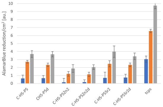 Viability of MG-63 osteoblast-like cells cultured on biocomposites containing 10% wt. of sodium hyaluronate, 45% wt. of chitosan, and 45% wt. of bioglass treated at 550 °C/3 h (C–H5–P5, C–H5–P5Zn2, C–H5–P5Sr2) or at 650 °C/10 h (C–H5–P5d, C–H5–P5Zn2d, C–H5–P5Sr2d) (tested using AlamarBlue® on days 1, 3, and 7 (blue, yellow, and grey bars, respectively). The results are presented as average standard deviation, n = 3; statistically significant differences compared to TCPS for the corresponding time points at p < 0.001 were found for all the samples.