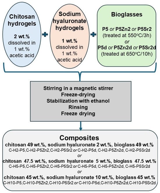 The evaluation involved composites containing 5 wt.% sodium hyaluronate, 47.5 wt.% chitosan, and 47.5 wt.% bioglass treated at 550 °C/3 h (C–H5–P5, C–H5–P5Zn2, C–H5–P5Sr2) or at 650 °C/10 h (C–H5–P5d, C–H5–P5Zn2d, C–H5–P5Sr2d) and containing 10 wt.% sodium hyaluronate, 45 wt.% chitosan, and 45 wt.% bioglass treated at 550 °C/3 h (C–H10–P5, C–H10–P5Zn2, C–H10–P5Sr2) or at 650 °C/10 h (C–H10–P5d, C–H10–P5Sr2d).