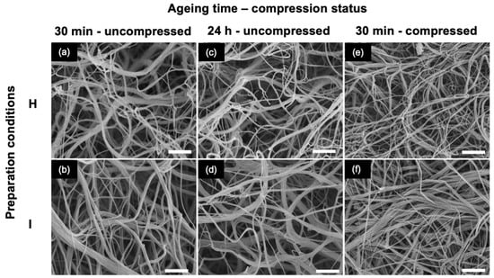 In the second stage, the influence of gel aging before compression was studied for H and I conditions. Scanning electron microscopy (SEM) imaging of the hydrogels aged for 30 min showed that H consists of a porous network of highly intertwined thin fibrils, less than 100 nm in diameter, sometimes assembled as fibrous bundles up to 500 nm in diameter (Figure 3a). For sample I, a lower occurrence of thin fibrils could be observed, and the largest fibers could be up to 1 μm in diameter (Figure 3b). No clear modification could be observed for gels aged for 24 h, whatever the condition (Figure 3c,d). After compression, a top-view image of the gels aged for 30 min showed a decrease in the network porosity (Figure 3e,f). The largest bundles seemed partially unraveled, as particularly visible in condition I (Figure 3f). These observations were similar for gels aged for 30 min and 24 h (Figure S1).