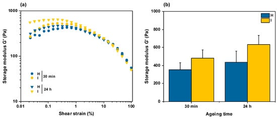 Rheological properties of hydrogels prepared in conditions H and I and compressed after 30 min or 24 h aging. (a) Evolution of storage modulus G′ as a function of applied shear deformation at fixed frequency (10 Hz). (b) Influence of preparation condition and aging time on storage modulus G′ at 0.1% shear deformation.