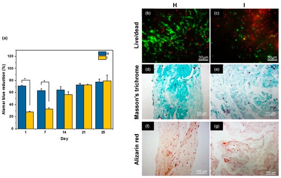Metabolic activity, viability, and mineralization of SHEDs cells cultured within compressed collagen hydrogels prepared in conditions H and I. (a) Evolution of Alamar Blue reduction over 25 days of culture for the two conditions, (b,c) Live/Dead images of SHED cells after 25 days of culture. Green and red color are for live and dead cells, respectively. Scale bar: 30 µm. (d,e) Masson’s Trichrome and (f,g) Alizarin Red staining of SHED-cellularized hydrogels after 25 days of culture. * p < 0.05.