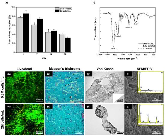 Metabolic activity, viability, and mineralization of hDPSCs cultured within compressed collagen hydrogels prepared in condition H with initial cell density of 0.8 M/mL and 2 M/mL under osteo/odontogenic conditions. (a) Evolution of Alamar Blue reduction over 25 days of culture for the two cell densities, (b,c) Live/Dead images of hDPSCs cells (green and red color are for alive and dead cells, respectively) and (d,e) Masson’s Trichrome staining of hydrogels sections after 25 days of culture. Scale bar: 100 µm. (g,h) Von Kossa staining, (i,j) SEM imaging and EDX analysis after 25 days of culture, (f) FTIR spectra of hydrogels after 25 days in culture conditions in the absence of cells and for 0.8 M·mL−1 or 2 M·mL−1 initial cell density.