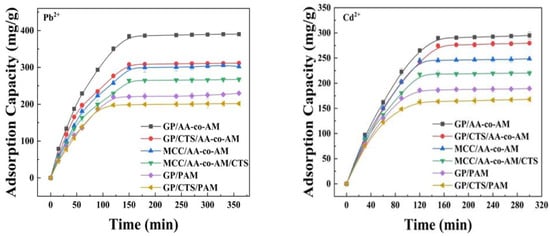 The adsorption capacities of hydrogels for heavy metals followed the order of GP/AA-co-AM > GP/CTS/AA/co-AM > MCC/AA-co-AM > MCC/AA-co-AM/CTS > GP/PAM > GP/CTS/PAM. The most significant adsorption capacities were observed at a pH of 4.0 for Pb2+ and Cd2+ on GP/AA-co-AM, reaching 390.3 mg/g and 262.3 mg/g, respectively. Similarly, GP/CTS/AA-co-AM exhibited considerable adsorption capacities of 312.7 mg/g and 243.4 mg/g for Pb2+ and Cd2+, respectively. These values surpassed the adsorption capacities of MCC/AA-co-AM (307.6 mg/g for Pb2+ and 238.1 mg/g for Cd2+) as well as MCC/AA-co-AM/CTS (269.4 mg/g for Pb2+ and 220.1 mg/g for Cd2+). The disparities in the adsorption capacity between the GP-based hydrogels and the MCC-based hydrogels can be ascribed to the existence of lignin within GP. Lignin functions analogously to amphiphilic cations and has been proposed to attenuate the hydrophobic interactions associated with cellulose, thereby expediting its dissolution [48]. Hence, lignin functions as an eco-friendly additive that amplifies the dissolution of cellulose within aqueous-based cold alkali systems, resulting in the exposure of more active sites, thereby enhancing the adsorption capacities of GP/AA-co-AM and GP/CTS/AA-co-AM hydrogels [49].