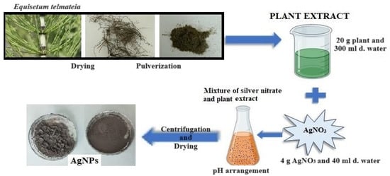 A solution of silver nitrate (AgNO3) was prepared by combining 4 g of AgNO3 with 40 mL of distilled water using a magnetic stirrer at room temperature. Concurrently, 250 mL of the plant extract was mixed in a mechanical mixer at 300 rpm at room temperature. The AgNO3 solution was then added dropwise to the plant extract using an automatic pipette. The pH of the resulting mixture was adjusted to 11 at room temperature using 1 M NaOH. The resultant mixture was centrifuged at 10,000 rpm for 15 min. Following centrifugation, the precipitate was washed to eliminate liquid plant residues. Specifically, the precipitate was washed once with 97% ethyl alcohol, followed by three washes with distilled water. Subsequently, the residue was dried at 60 °C in a laboratory oven for 48 h to obtain the final product [59].