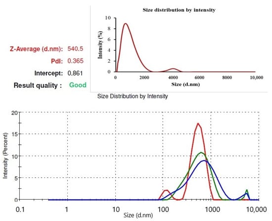 A Zetasizer device, SEM, UV–Vis, and FT-IR spectrophotometers were used to characterize AgNPs. The size distribution of AgNPs by intensity is presented in Figure 2, and 3 measurements are taken by the device. These are specified in 3 different colors: red, green and blue. As a result of the measurements, the values are determined by calculating the average. The analysis was performed in three repetitions, and the results were presented as the average of the obtained values. The size of the nanoparticles was 540.5 ± 27.72 nm, and the polydispersity index was 0.365. Because the polydispersity index of the nanoparticles was less than the value of 0.7 stated in the literature, nanoparticles were used in the experiments [27].