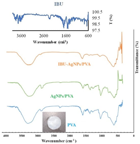 The FT-IR spectrum of the IBU-AgNP/PVA film is also presented in Figure 6. When the graphical results of the PVA and AgNP/PVA films obtained from the FT-IR spectra were evaluated, the hydrogel films were found to not undergo any change in their copolymeric properties. When comparing the FT-IR spectra of films with and without the active ingredient, no major peak change was observed between the graphs. When examining films containing ibuprofen, the film was found to maintain its chemical properties. When the graphical results of PVA, AgNP/PVA, and IBU-AgNP/PVA films were evaluated, it was concluded that AgNP and ibuprofen were not collected on the surface of the polymer, and they were instead trapped inside the polymer. The sharp, characteristic peaks of ibuprofen were not present in its current spectrum after being loaded into the film. In addition, when the obtained spectra were examined, it was thought that ibuprofen did not interact with the polymer and metal nanoparticles, as no peak formation indicating the existence of new interactions was observed.