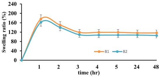 Graph of the swelling ratios of B1 and B2 hydrogels.