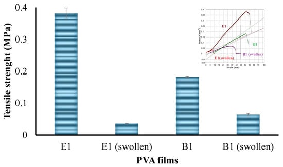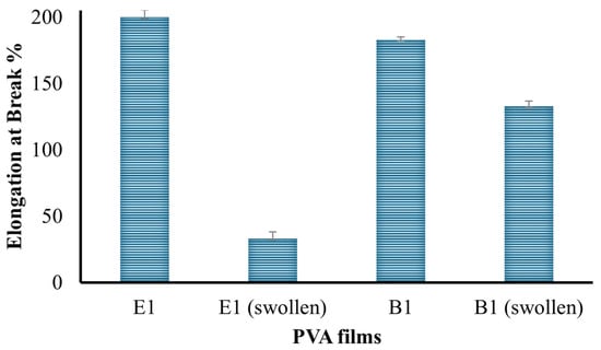 The percent elongation at break of the B1 and E1 films and their swollen forms is given in Figure 9, and the tensile strength (MPa) is given in Figure 10. The PVA hydrogel prepared at a ratio of 10% (w/v) displayed relatively higher tensile strength than that prepared at 5% (w/v). The maximum force and elongation at break also exhibited the same behavior, consistent with the literature [38,39].