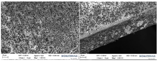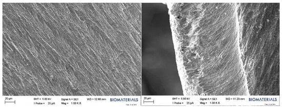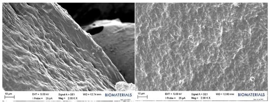 Within the scope of this study, SEM analysis of the arranged E1, B1, and swollen E1 hydrogels was performed to obtain information about their morphological structures. Editing of SEM recordings and comparisons of B1 (Figure 11) and E1 (Figure 12) hydrogel films were performed. The E1 hydrogel film exhibited a more homogeneous and integrated structure than the B1 film. The average values decreased as the amount of PVA increased. Owing to the increase in the amount of PVA, the performance of PVA–PVA crosslinks improves when films have a smoother structure [40]. In this study, the freeze–thaw technique was employed three times during the preparation of PVA hydrogels with the aim of achieving the physical self-crosslinking of PVA [41], eliminating the need for a crosslinker. Physical self-crosslinking of PVA without external crosslinking agents has several advantages in certain applications. The process simplifies manufacturing by eliminating the need for additional agents, making it a cost-effective and straightforward option. In addition, the absence of external crosslinkers might be advantageous in applications in which reducing chemical additives is a priority, such as in medical or food-contact scenarios. Self-crosslinked PVA could also exhibit enhanced biocompatibility and reduced toxicity compared to formulations containing external crosslinking agents, making it suitable for specific medical or pharmaceutical applications [42]. It has been observed that the thickness of PVA does not lead to agglomeration of the coating and that the PVA film is distributed homogeneously. A similar result was obtained for different amounts of crosslinked PVA solutions using the freeze–thaw technique [43,44]. The SEM images illustrated that as the PVA ratio increased, the hydrogels became smaller, and their walls became thicker.