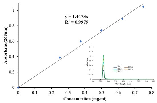 To draw the calibration curve of ibuprofen, samples prepared at concentrations of 0.25, 0.375, 0.5, 0.625, and 0.75 mg/mL were used. The calibration curve and UV–Vis spectra of a series of ibuprofen solutions used to draw the curve are presented in Figure 14. As illustrated in the figure, the characteristic peak of ibuprofen was observed at 269 nm [46]. The calibration curve was drawn using the values obtained at this wavelength in the spectra.