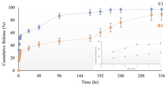Cumulative release graph of the hydrogel-structured B1 and E1 films.