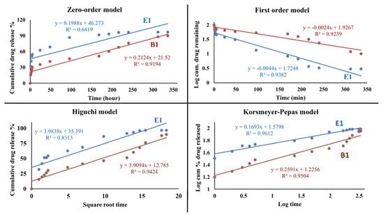 Zero–order, first–order, Higuchi, Korsmeyer–Peppas kinetic models of B1 and E1 films.