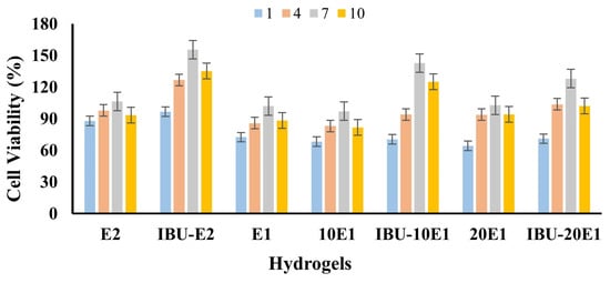 MTT analysis results of the samples E1 (1 mg AgNPs/PVA), E2 (PVA), IBU-E2 (IBU-PVA), IBU-E1 (IBU-1 mg AgNPs/PVA), 10E1 (10 mg AgNPs/PVA), IBU-10E1 (IBU-10 mg AgNPs/PVA), 20E1 (20 mg AgNPs/PVA), and IBU-20E1 (IBU-20 mg AgNPs/PVA) are given in Figure 17. PVA films included different amount of AgNPs; E1: 1 mg AgNPs, 10E1: 10 mg AgNPs, and 20E1: 20 mg AgNPs. Indirect samples of the prepared films were collected on days 1, 4, 7 and 10 and stored at +4 °C until used. From the MTT analysis results, depending on the days, the cell viability of the E2 film was generally stable, whereas the cell viability of all samples first increased and then decreased over the days. The reason for this finding was that based on the release experiments, the IBU-loaded PVA films released 40–50% of the loaded drug. The cell viability of the E2 film was approximately 90–100%, its biological compatibility was high, in line with the literature, and its activity was stable [54].