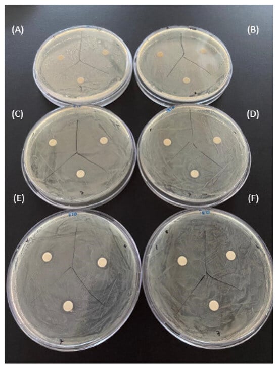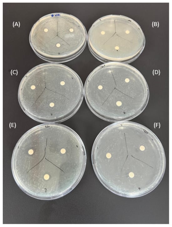 The activities of the prepared hydrogel films against Gram-negative Escherichia coli and Gram-positive Staphylococcus aureus were examined [66]. Bacterial colonies were taken from stocks of both species prepared in 5 mL of sterile Mueller–Hinton broth and incubated in a shaking oven at 37 °C for 18 h. After incubation, the bacteria were spread in 100 µL aliquots onto previously prepared Mueller–Hinton agar using a Drigalski spatula. There are various methods to determine the antibacterial activities of the prepared hydrogel films. The agar disc diffusion method was carried out to detect the antibacterial activity [67]. Each set of the PVA films’ 20 µL liquid samples was impregnated onto the antimicrobial susceptibility test discs. The antibacterial activities were observed by incubating the Petri dishes in a 37 °C oven for 24 h.