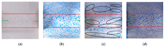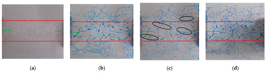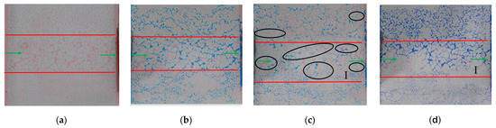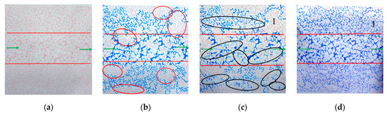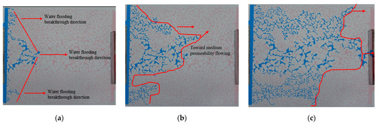The water flooding process is shown in Figure 1. In Figure 1, Figure 2, Figure 3, Figure 4, Figure 5, Figure 6, Figure 7, Figure 8 and Figure 9, blue is the simulated water, red is the simulated oil, white is the rock skeleton, and the displacement direction is from left to right. The red circle indicates remaining oil, the black circle represents gel particles, and the green arrow indicates the inlet and outlet. In the early stage of water flooding, the overall performance of the water drive front is finger breakthrough. This means that the high-permeability section advances rapidly, while the middle- and low-permeability sections on both sides progress slowly, leading to the formation of local finger phenomenon within each penetration section (Figure 1a). With the increase in displacement pressure and the difference of oil−water viscosity, the injected water not only advances forward, but also spreads to both sides of the model (Figure 1b). The analysis shows that the occurrence of this phenomenon depends on the degree of pore connectivity at the interface between the permeability zones. The connection of different permeability zones belongs to the intralayer connection, where the pores on both sides are in an almost interconnected state, with the large pores dominating. At this time, the degree of pore connection has improved, and the speed of the two sides is faster. If the connection belongs to the interlayer connection, meaning there is a certain degree of interlayer at the connection, which makes the displacement phase unable to spread to another permeability zone, then the degree of pore connection is poor, and the speed of the two sides is slow or almost zero. However, the formation of the overall fingering phenomenon of water flooding is still dominated by the pore size. The injected water is rapidly channeled along the middle high-permeability section to form the dominant channel, followed by the middle-permeability section above (Figure 1c).