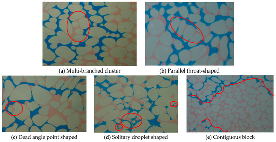 After water flooding, the oil−water distribution image of the model is locally enlarged, the distribution law of the remaining oil is analyzed, and the remaining oil is quantitatively assessed using image analysis software. As shown in Figure 2, the distribution types of the remaining oil in the model after water flooding are summarized as follows: (1) Large pores surrounded by multiple fine pore throats, making it difficult for injected water to overcome large seepage resistance and form multi-branch cluster residual oil (Figure 2a); (2) A small pore throat is formed in parallel with the large pore channel. The injected water tends to enter the larger pores, bypassing the smaller ones, and eventually establishes a consistent and stable flow pathway within the larger pores, resulting in the formation of parallel residual oil reservoirs. (Figure 2b); (3) In situations where there is only a single flow outlet outside the channel and the injected water flows vertically towards the outlet end, it becomes challenging for the injected water to alter the direction of its streamline and create a pressure differential within the channel. As a result, this leads to the formation of dead-angle points where residual oil accumulates. (Figure 2c); (4) When the rock surface is hydrophilic, the injected water tends to flow along the contours of the rock surface, thereby creating isolated droplets of residual oil in the central region of the larger channel. (Figure 2d); (5) In the place where a large number of small pores exists or the large pores are nearly enclosed by small pores, it becomes challenging for the injected water to create a local breakthrough and subsequently disperse the flake oil, thus forming a contiguous block of residual oil (Figure 2e) [31,32,33,34]. The distribution of various types of remaining oil after water flooding is statistically analyzed. It can be seen from Figure 3 that the contiguous block, parallel throat shape, and multi-branch cluster shape account for more than 20%, and the remaining oil types mainly consist of these three types.
