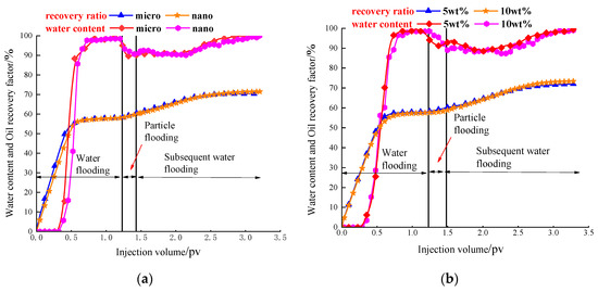 Comparison of the change in the oil recovery factor and water content in the core flooding experiment:(a) Change particle size; (b) Change particle concentration.