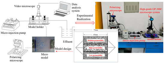 Using the visual microscopic glass etching model, we designed various key parameters for particles. The aim was to explore the mechanism of profiling and flooding effects caused by the key parameters of the gel particle profile control agent at the micro level. Furthermore, we studied the mechanism of water flooding and the distribution of remaining oil. Equipment: high-grade GP−300C microscope system, polarizing microscope, micro-injection pump, model holder, etc., as shown in Figure 11. The internal pore size of the microscopic model is 45 mm × 45 mm. The penetration zone and three connected channels are etched at the inlet and outlet of the model. The upper, middle, and lower parts of the three penetration sections correspond to different permeability zones: the medium-permeability zone with a throat diameter of 10–20 μm, the high-permeability zone with a throat diameter of 20–30 μm, and the low-permeability zone with a throat diameter of 5–10 μm.