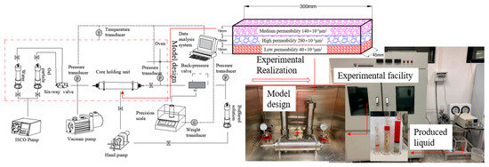 It is used to analyze the profile control and flooding effects of gel particles and verify the characteristics of microscopic profile control and flooding mechanisms. Equipment: High-temperature and high-pressure core flow evaluation device includes an advection pump, thermostat, hand pump, core holder, intermediate container, etc., as shown in Figure 12. The simulated water and gel particle profile control agent is the same as that used in the microscopic experiment. The simulated oil is industrial white oil (102 °C, 1.64 mPa·s). The permeability design of the three-layer heterogeneous core model was based on the permeability distribution of the perforated interval of the control and flooding well group selected in the T block of the Tahe oilfield. Finally, the permeability design for the rectangular three-layer heterogeneous core used in the laboratory experiment was upper/middle/lower corresponding to the medium permeability/high permeability/low permeability = 140/280/40 × 10−3 μm2, 30 × 4.5 × 4.5 cm.